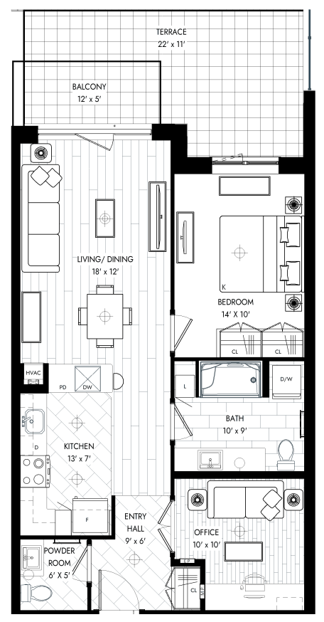 This expansive 2-bedroom apartment offers 1,037 sq. ft. of thoughtfully designed, open-concept living, complete with a private balcony. The versatile office provides the perfect space for working from home or a quiet retreat. Premium finishes include multilayered hardwood flooring, granite countertops, natural wood cabinetry, and soaring 9-foot ceilings. Solid concrete construction ensures superior soundproofing, while floor-to-ceiling windows flood the space with natural light. Enjoy modern comforts such as individual temperature control and high-efficiency climate systems for year-round comfort.